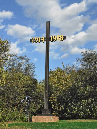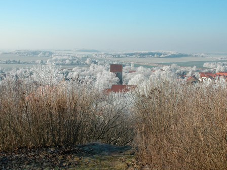 Vorbei an dichter werdenden Büschen führt der Pfad noch einmal bergauf und endet auf einer Lichtung mit - man möchte meinen, einem Gipfelkreuz. Tatsächlich erinnert das eiserne Denkmal mit der Aufschrift „1914-1918" an die Landsberger Opfer des 1. Weltkrieges. Von hier aus ergibt sich ein wunderbarer Blick auf die Landsberger Altstadt mit Stadtkirche und den engen Gassen. Im Hintergrund erheben sich die „grünen Inseln" der Stadt aus den Feldern. Die drei Porphyrkuppen sind dicht bewaldet und laden zum entspannten Waldspaziergang mit einem Hauch von Geschichte ein. Am Horizont zeichnet sich die Silhouette der Stadt Halle ab.