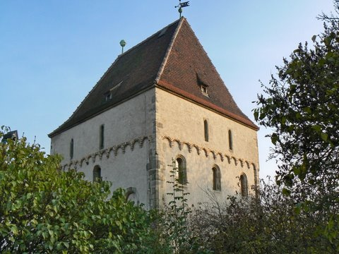 Die Landsberger Doppelkapelle in herbstlicher NachmittagsstimmungDas Gedenkkreuz am ehemaligen Standpunkt des Bergfriedes der Burg LandsbergHerbstlicher Blick auf den historischen Ortskern mit seinen mittelalterlichen GassenDie romanische Doppelkapelle Langsam gibt das Herbstlaub den Blick auf das romanische Bauwerk frei - Blick vom WanderwegKapelle und Gedenkkreuz in der Abendsonne